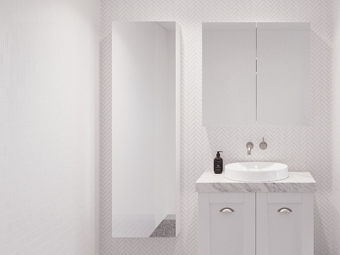The Float vanity, hovers elegantly above the bathroom floor, creating a graceful presence in the...
